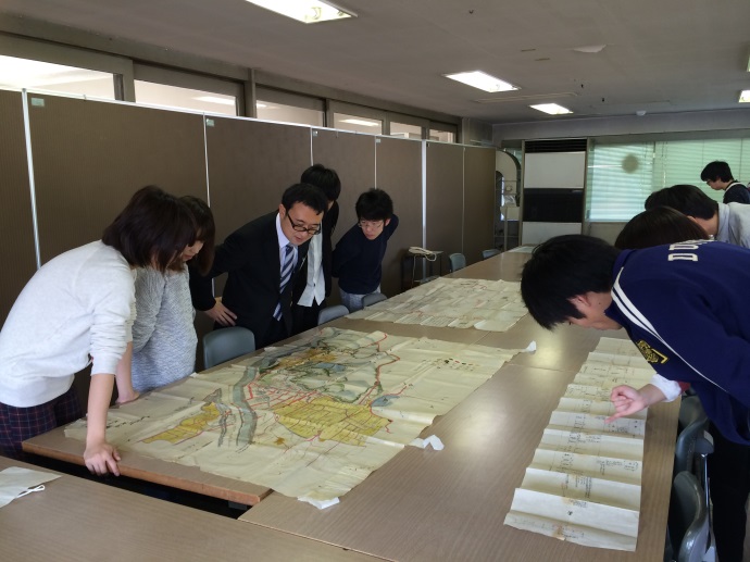 茂村や社家町の絵図を閲覧し、もう一方は地元の農家さんにて作業工程を見学しました。総合資料館で