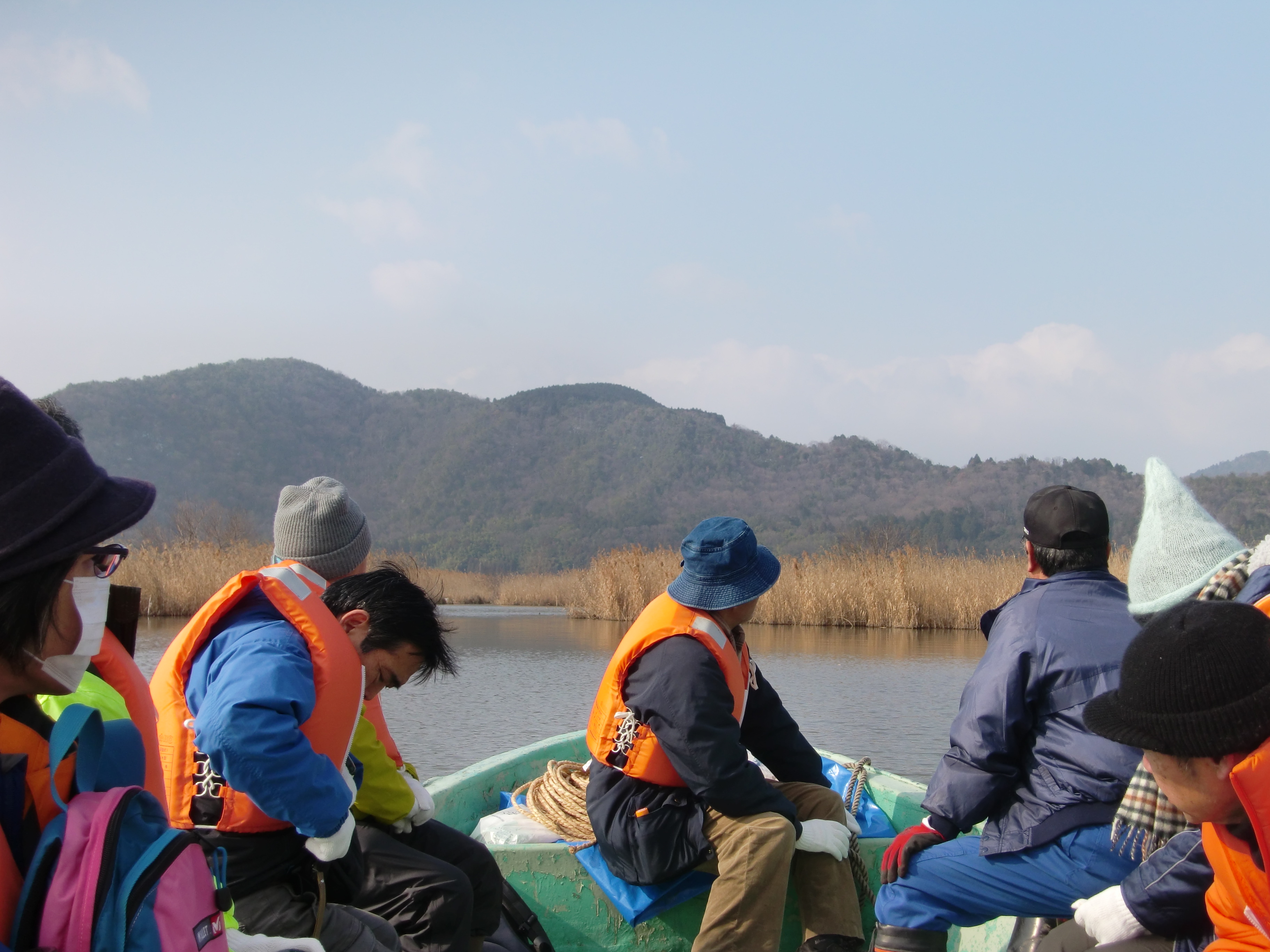 船に乗ってヨシ刈りの場所に向かいました。西の
